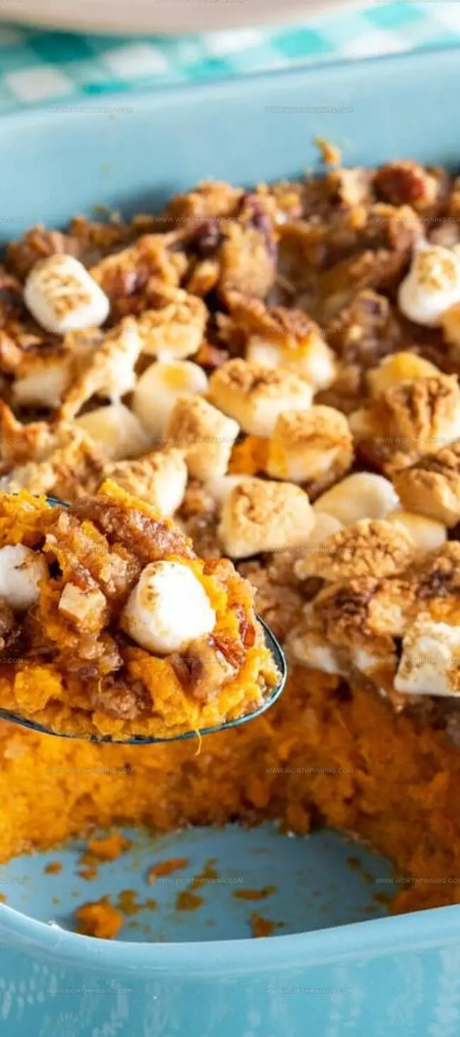 Pecans and marshmallows crown this luxurious dish, offering crunchy texture and caramelized sweetness.