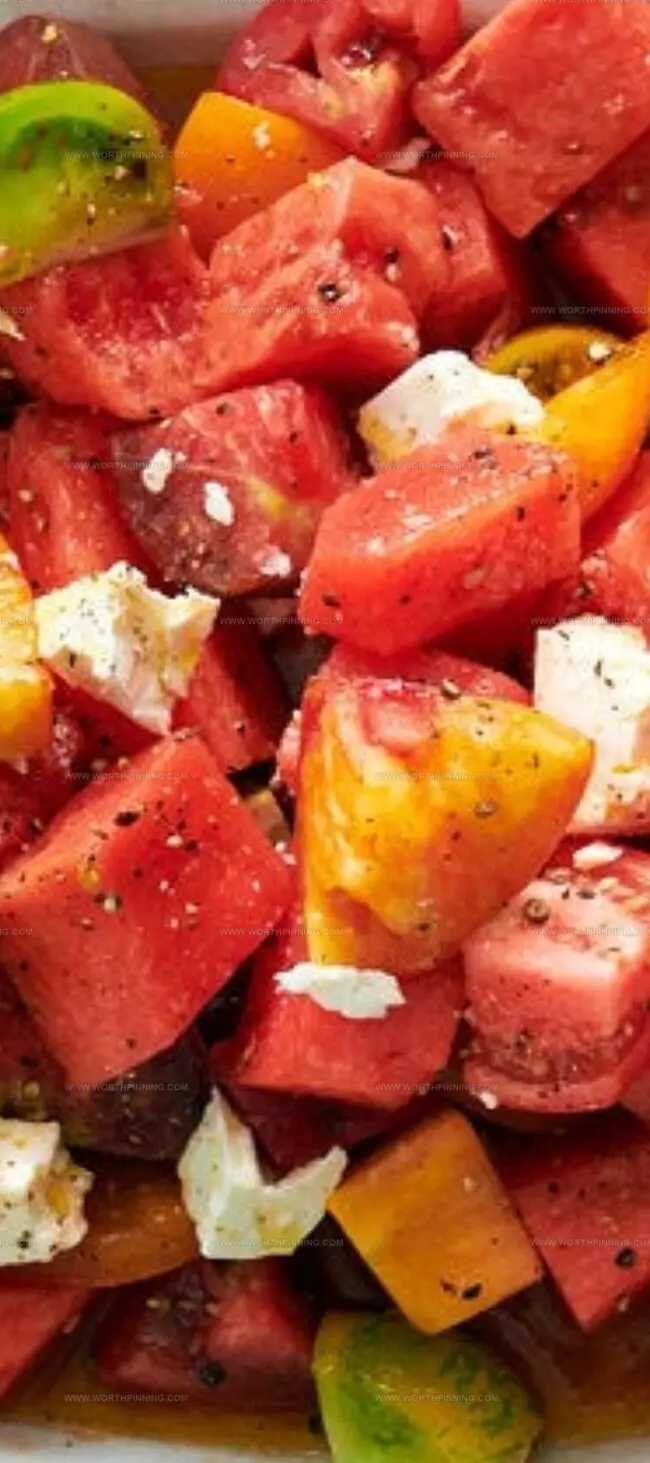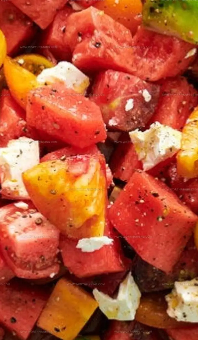 Crimson tomatoes and ruby watermelon cubes create a delightful canvas of sweetness and tang.