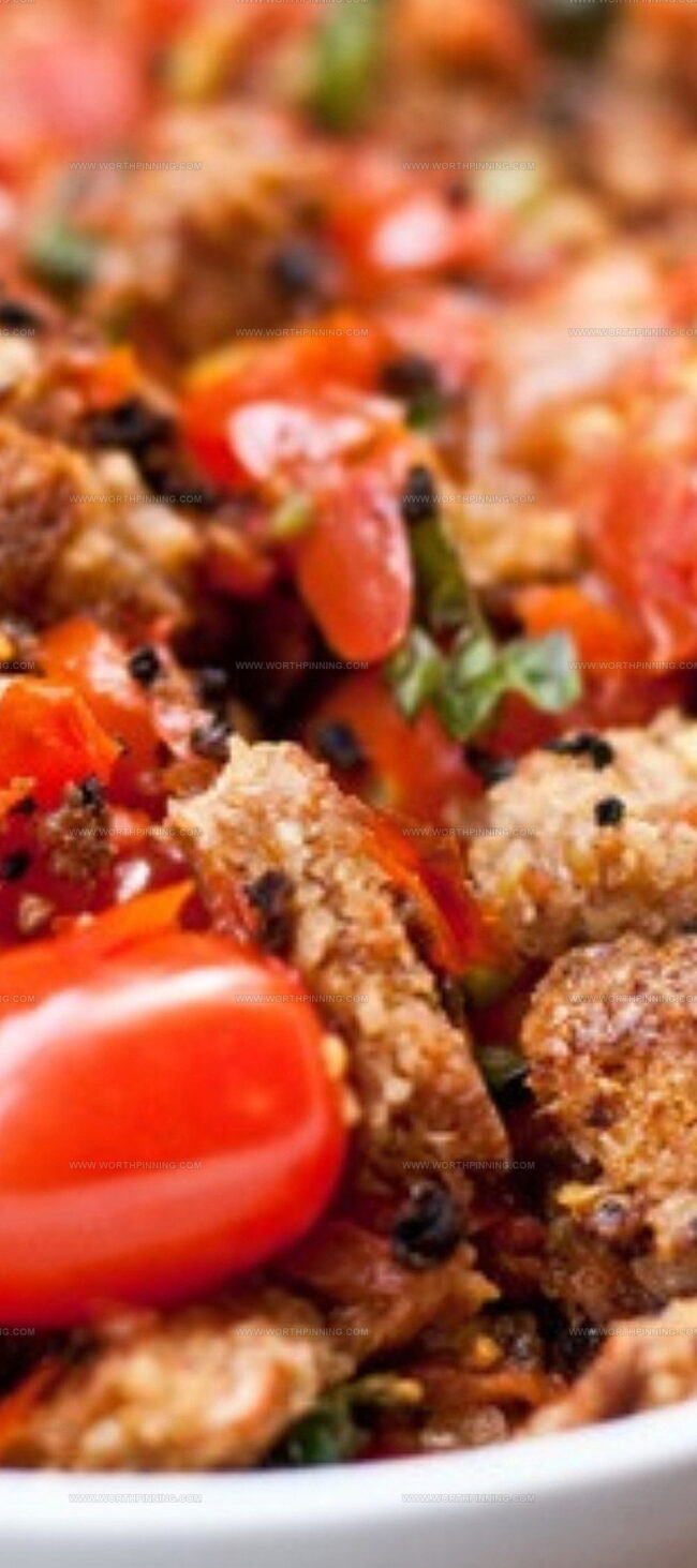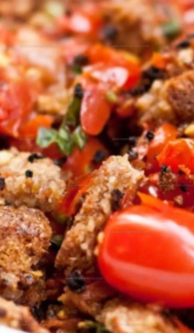 Assembly: Lightly oil a baking dish, layer the seasoned bread cubes as a crisp foundation, then generously spread the tomato mixture over the top, creating a vibrant base.