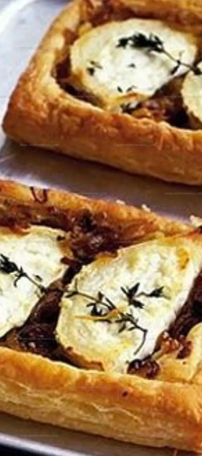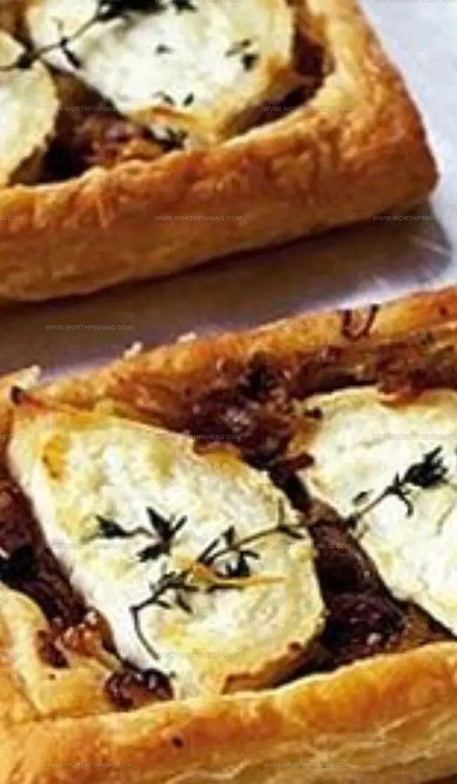 - Assemble Tarts: Spread caramelized onions within the scored border of each pastry rectangle. Arrange goat’s cheese slices evenly over the onions.