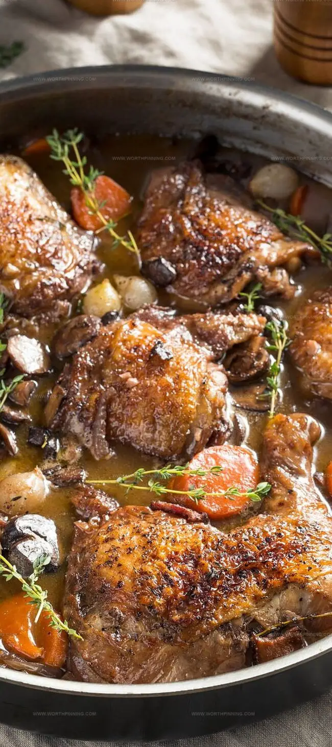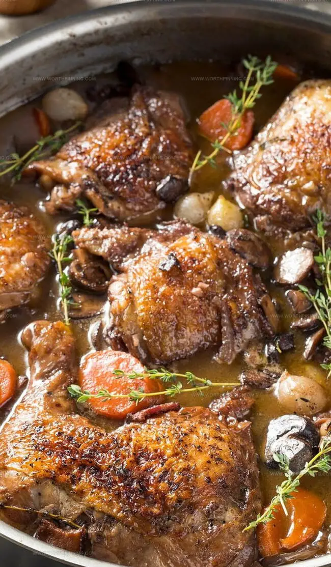 Wine-soaked poultry whispers tales of rustic kitchens and countryside elegance.