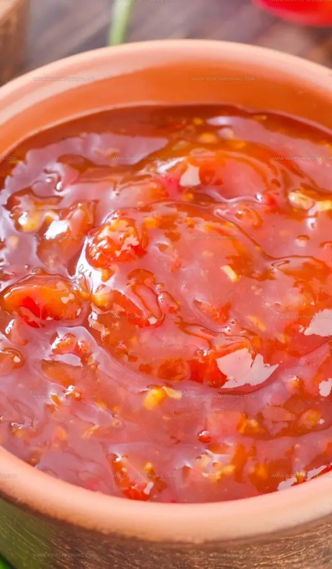 Crimson and glossy, this zesty condiment delivers a thrilling balance of sweet heat and tangy complexity.
