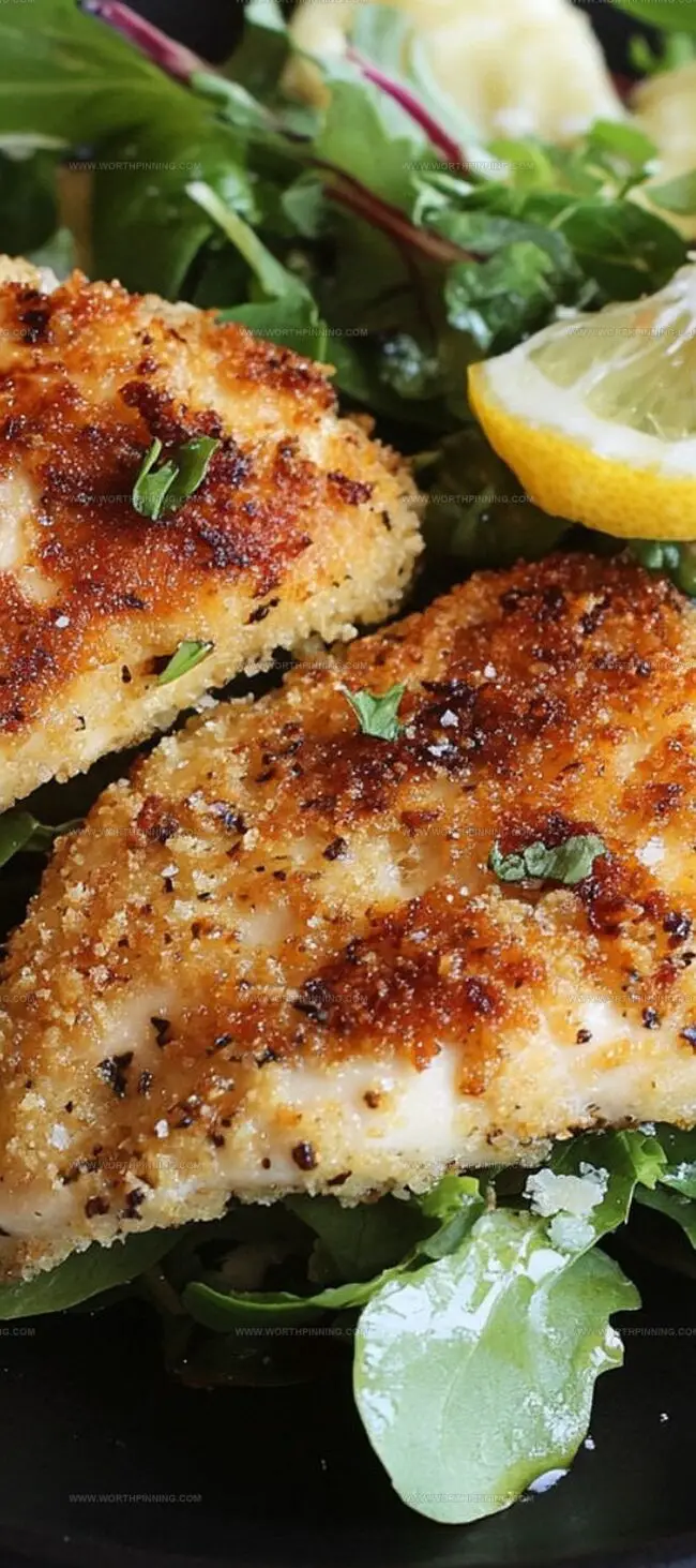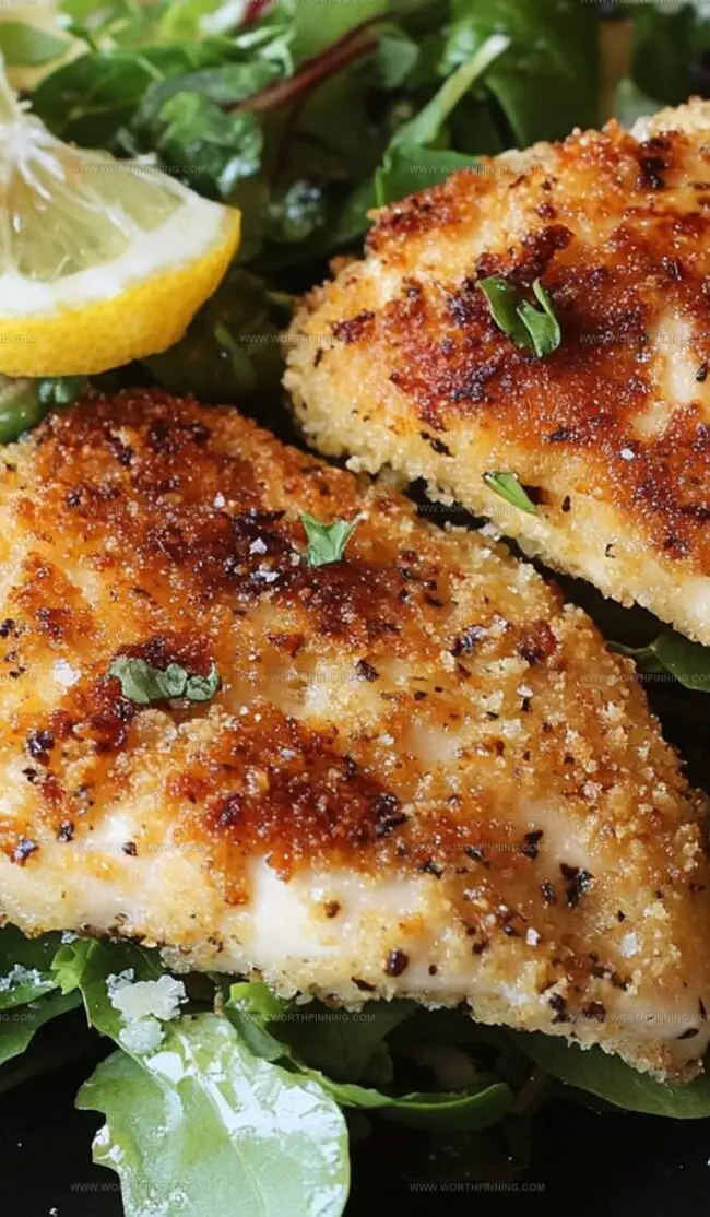 - Finish and Plate: Toss baby salad greens with lemon vinaigrette, then artfully arrange chicken on individual plates. Crown each breast with dressed greens and sprinkle with additional Parmesan cheese for an elegant presentation.