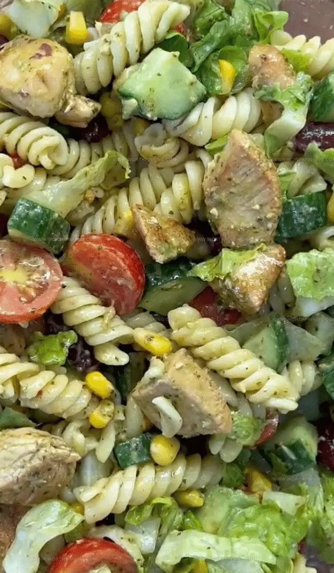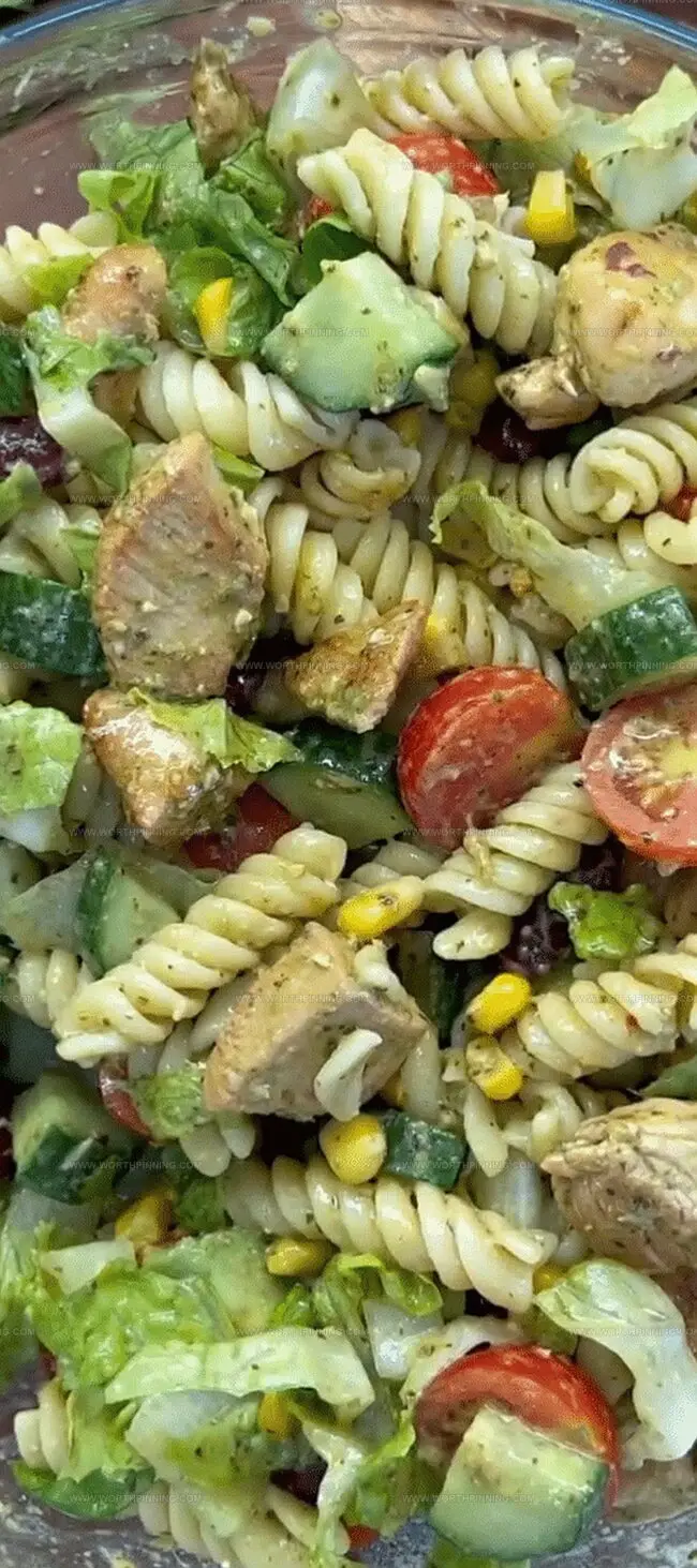 - In a spacious mixing bowl, combine the cooled fusilli pasta, chopped romaine lettuce, halved cherry tomatoes, diced cucumbers, sweet corn kernels, sliced avocado, cooled chicken cubes, and rinsed kidney beans.