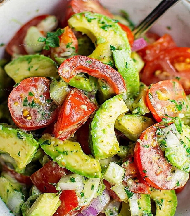 Refreshing tomato avocado salad combines garden-fresh ingredients with zesty Mediterranean flair. Crisp vegetables and creamy avocado dance together, creating a light and tangy experience perfect for summer gatherings.