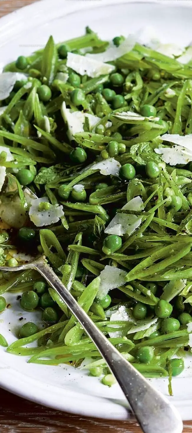 Herbal Whispers Fresh mint ribbons weave through tender peas, creating a fragrant landscape of green textures and delicate flavors.