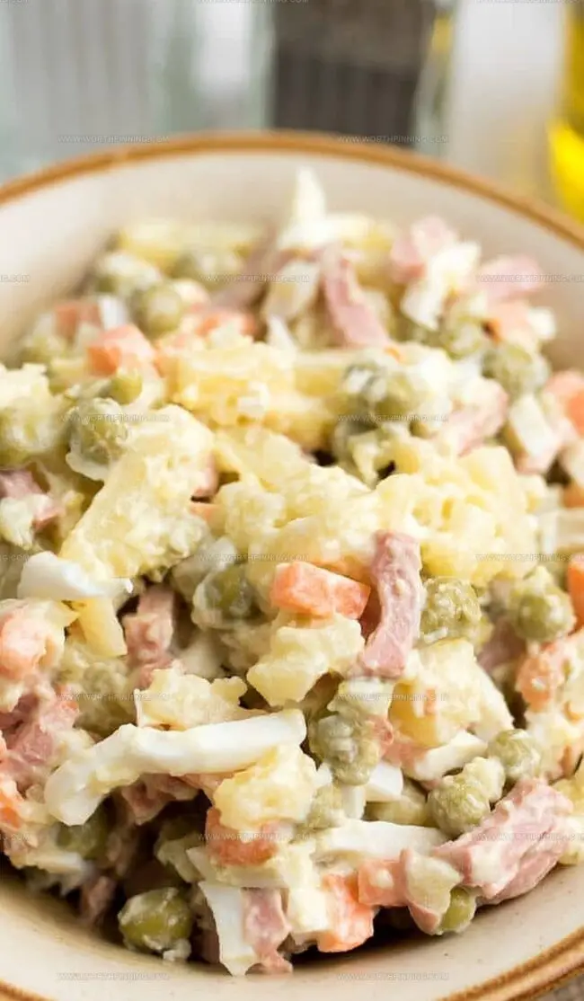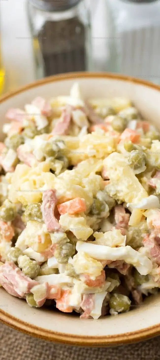 - Mixing Technique: In a spacious mixing bowl, combine diced potatoes, sliced carrots, chopped eggs, finely chopped pickles, sweet green peas, and diced ham.